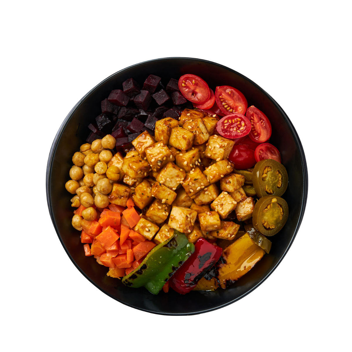 Tofu croustillant nappé d’une sauce Général Tao sucrée-épicée, accompagné de riz parfumé, pois chiches, betteraves, carottes croquantes, tomates fraîches et légumes grillés.